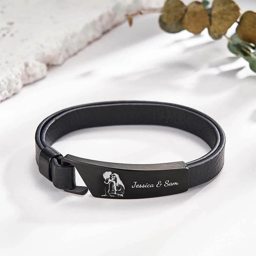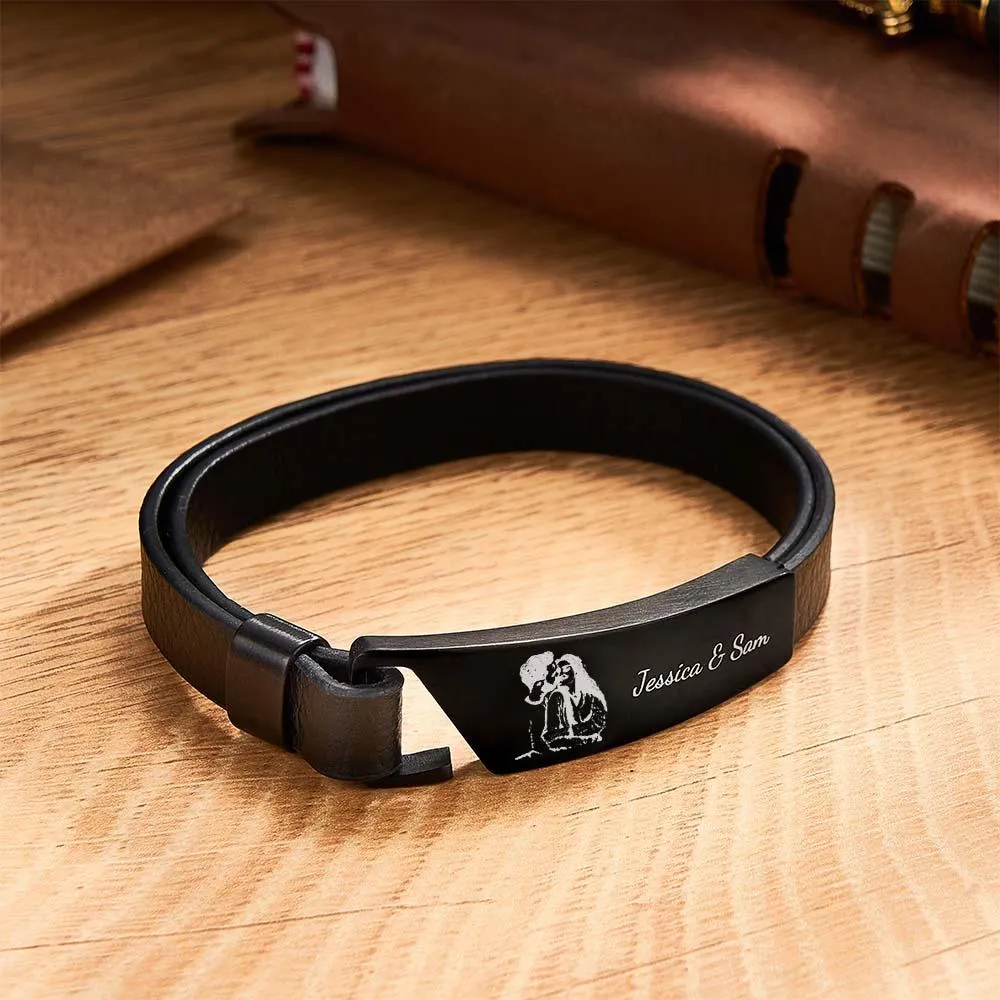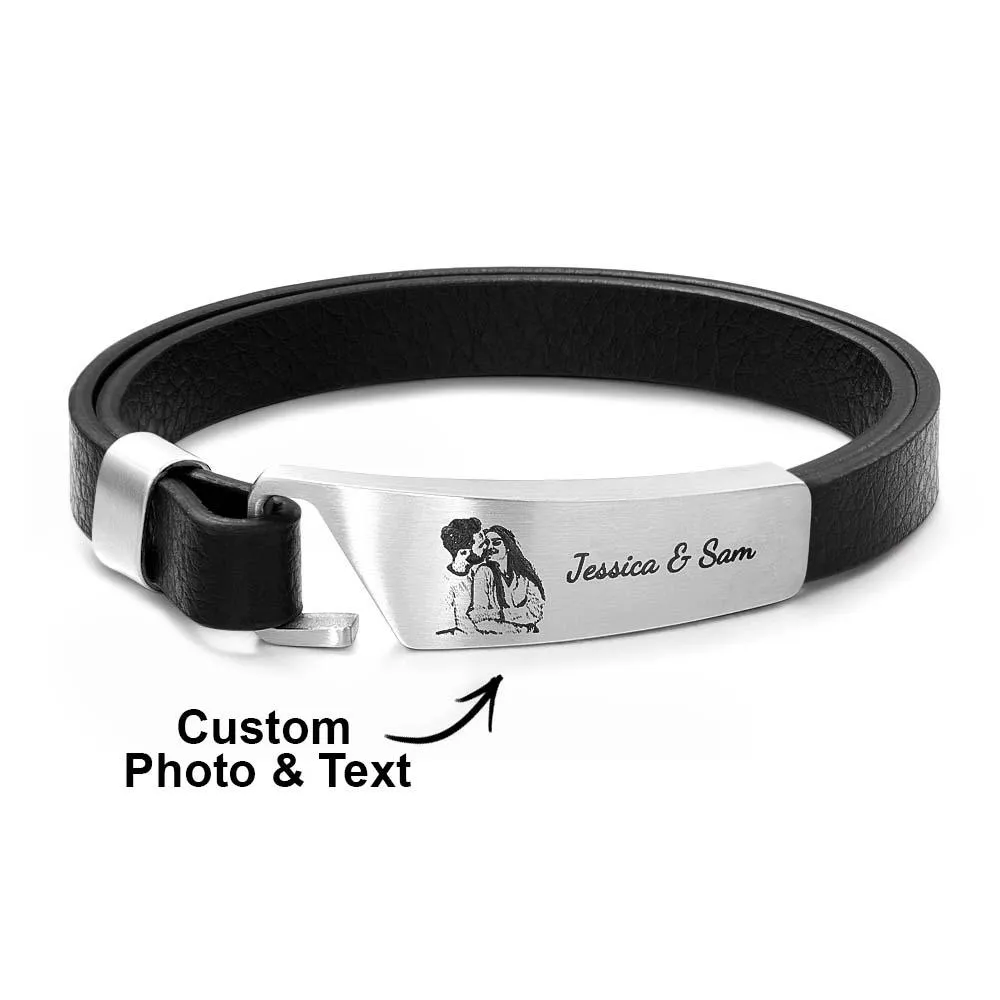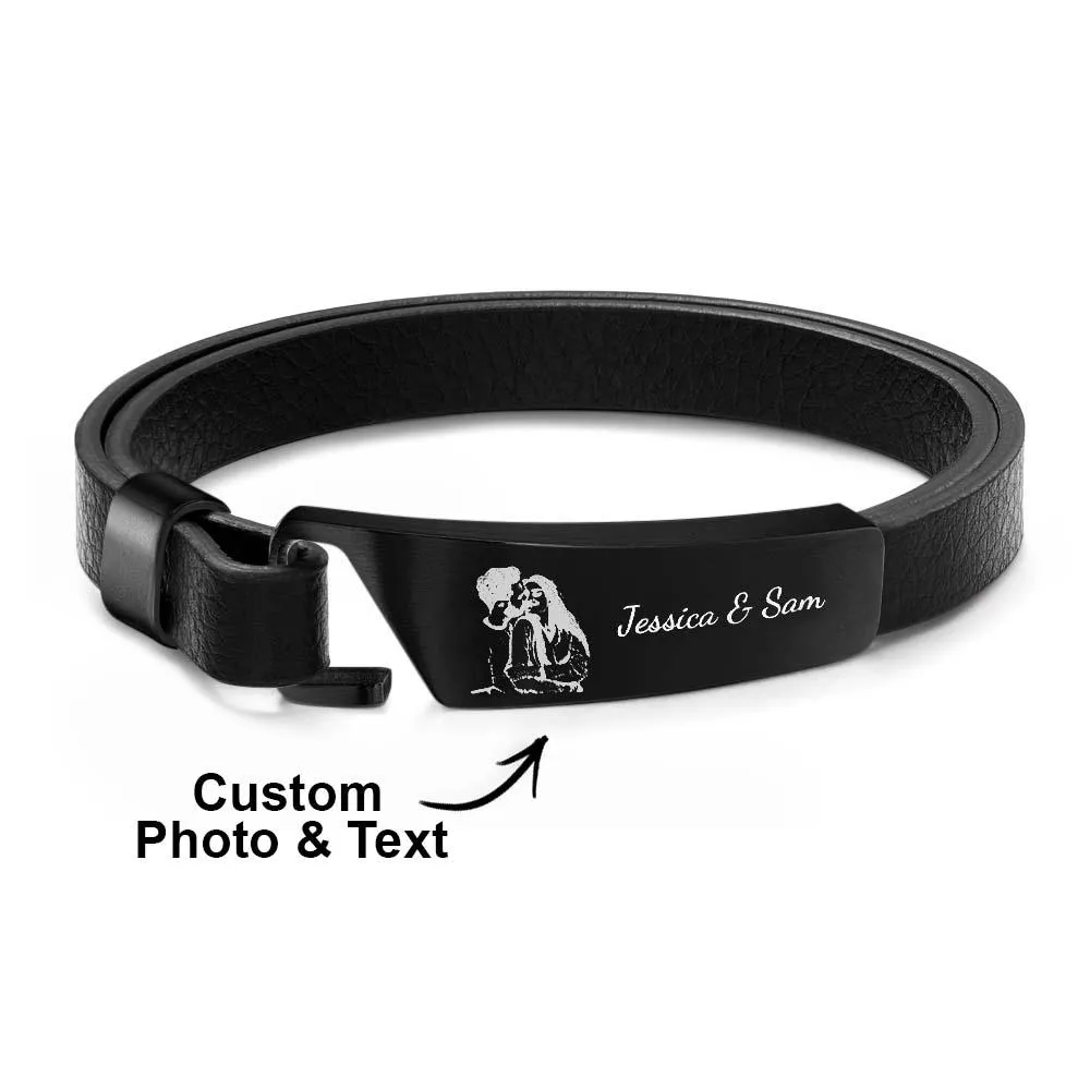 Celebrate personal style with our Personalized Photo and Text Leather Bracelet. Featuring custom photo and text engraving, this bracelet combines classic retro aesthetics with personal touches, making it a standout gift for men who appreciate timeless and unique accessories.