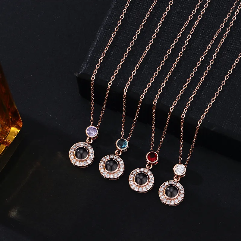 • Customized Round Pendant Projection Photo Necklace with Sparkling Stones and Birthstone – Perfect Gift for Her
