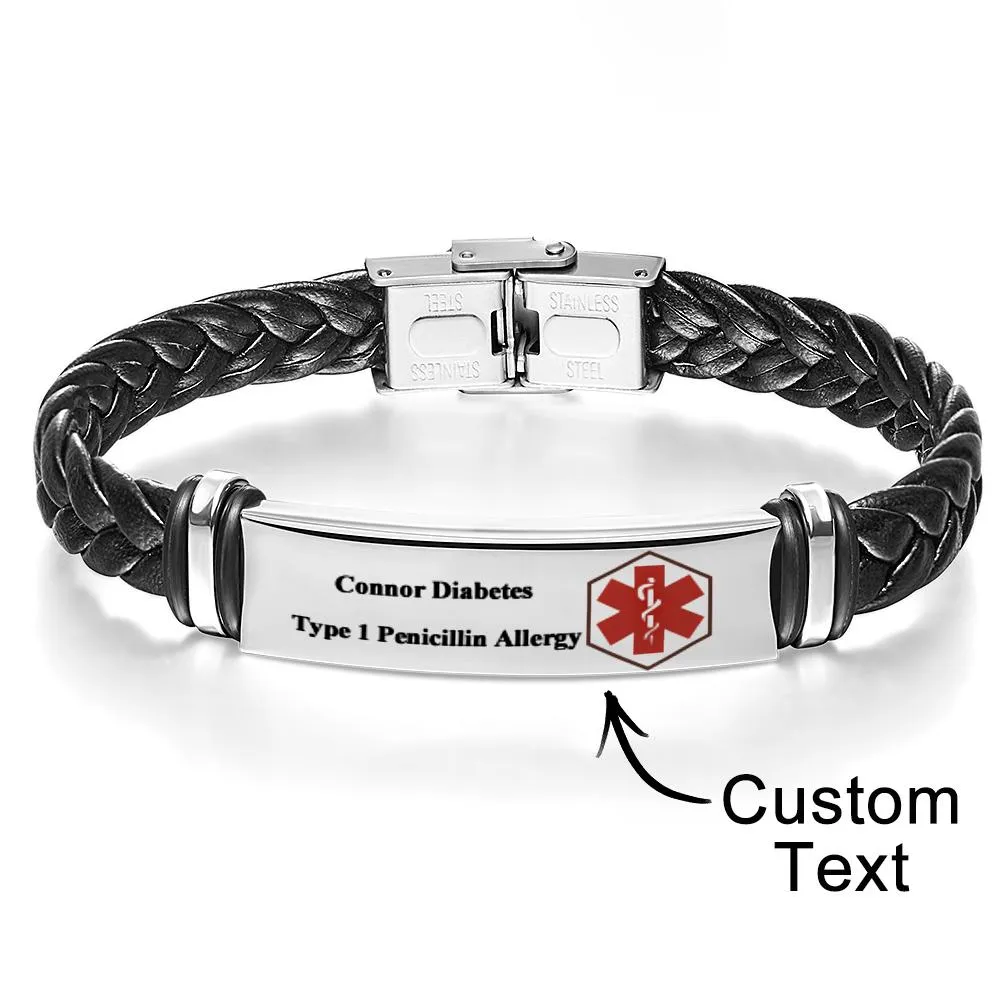 Custom Medical Alert Leather Bracelet – Personalized Emergency ID with Waterproof Features